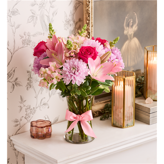 Thank Mom for a lifetime of comforting hugs with our Mother’s Embrace™ bouquet. Lovely pink and lavender blooms are hand-designed in a glass vase tied with a pink satin ribbon, creating a heartfelt expression of your feelings, whether you're celebrating Mother’s Day together or sending a smile from miles away.